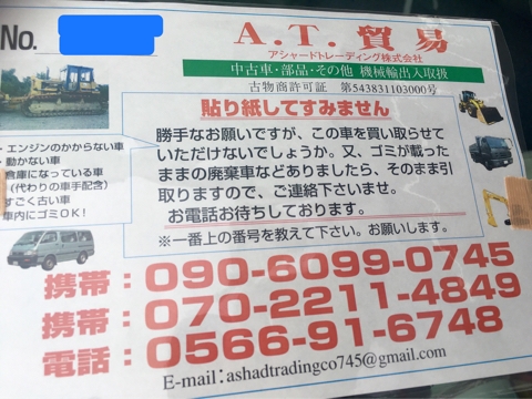 売るかハゲ! とか思いながら剥がして捨てる。 こんな非常識な会社なんか晒してやれと思ってツイッターにアップ。 それにしても会社名で検索かけても全く出てこない。 「車 貼り紙 買い取り」とかで検索すると、怪しい情報が。